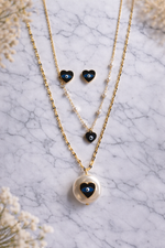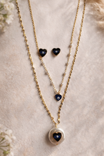 A chic layered gold-tone chain paired with evil eye heart earrings, designed to blend modern charm with symbolic elegance for a confident everyday statement.